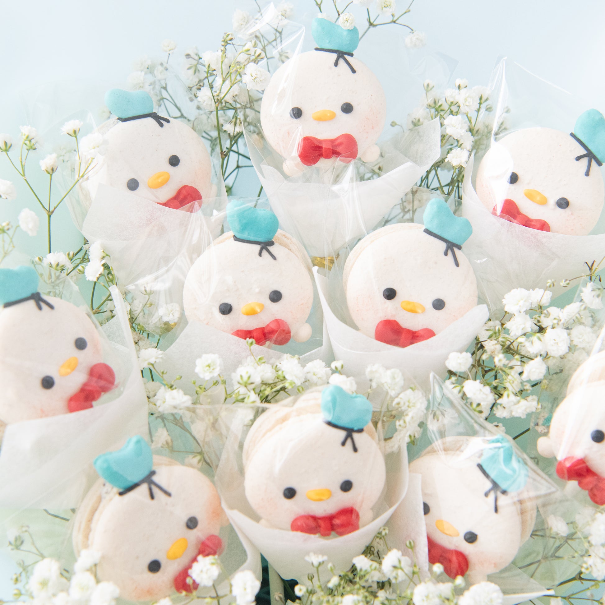 The Disney Tsum Tsum Donald Duck macaron bouquet showcases macarons shaped like the iconic Donald Duck. Each macaron is meticulously decorated with Donald's signature colors and charming details. This delightful bouquet combines delicious flavors with Disney magic, making it a perfect treat or gift for Donald Duck family