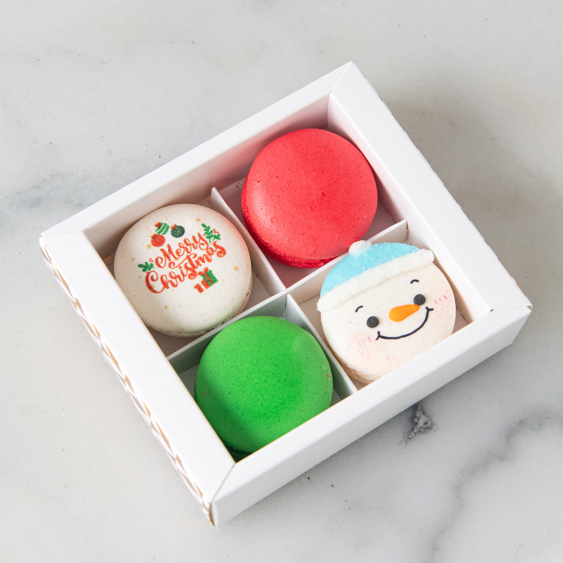Bring holiday cheer with our 4in1 Jolly Snowman Macaron set! This delightful collection features four Christmas-themed macarons — including a charming snowman character, a printed “Merry Christmas” macaron, and classic red and green macarons. Perfect for gifting, sharing, or indulging yourself, these sweet treats add a joyful touch to every festive celebration.