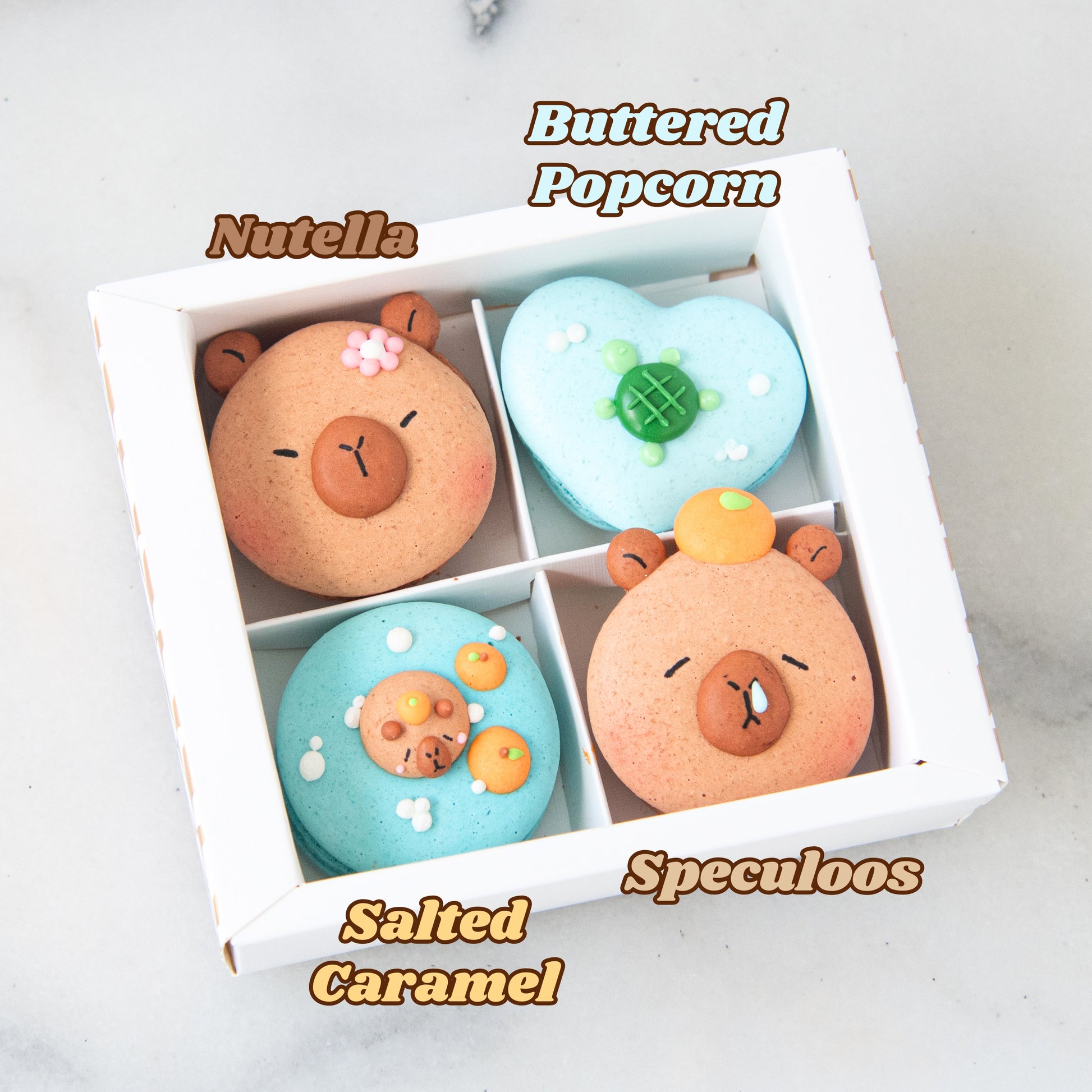 Treat yourself to the adorable 4in1 Capybara Macaron box, featuring four uniquely decorated capybara-themed macarons! Each cookie is a delightful blend of flavors and fun designs, perfect for sharing or indulging on your own. Whether you're a macaron lover or just a fan of cute critters, this box is sure to bring a smile to your face. Enjoy a tasty adventure with every bite!