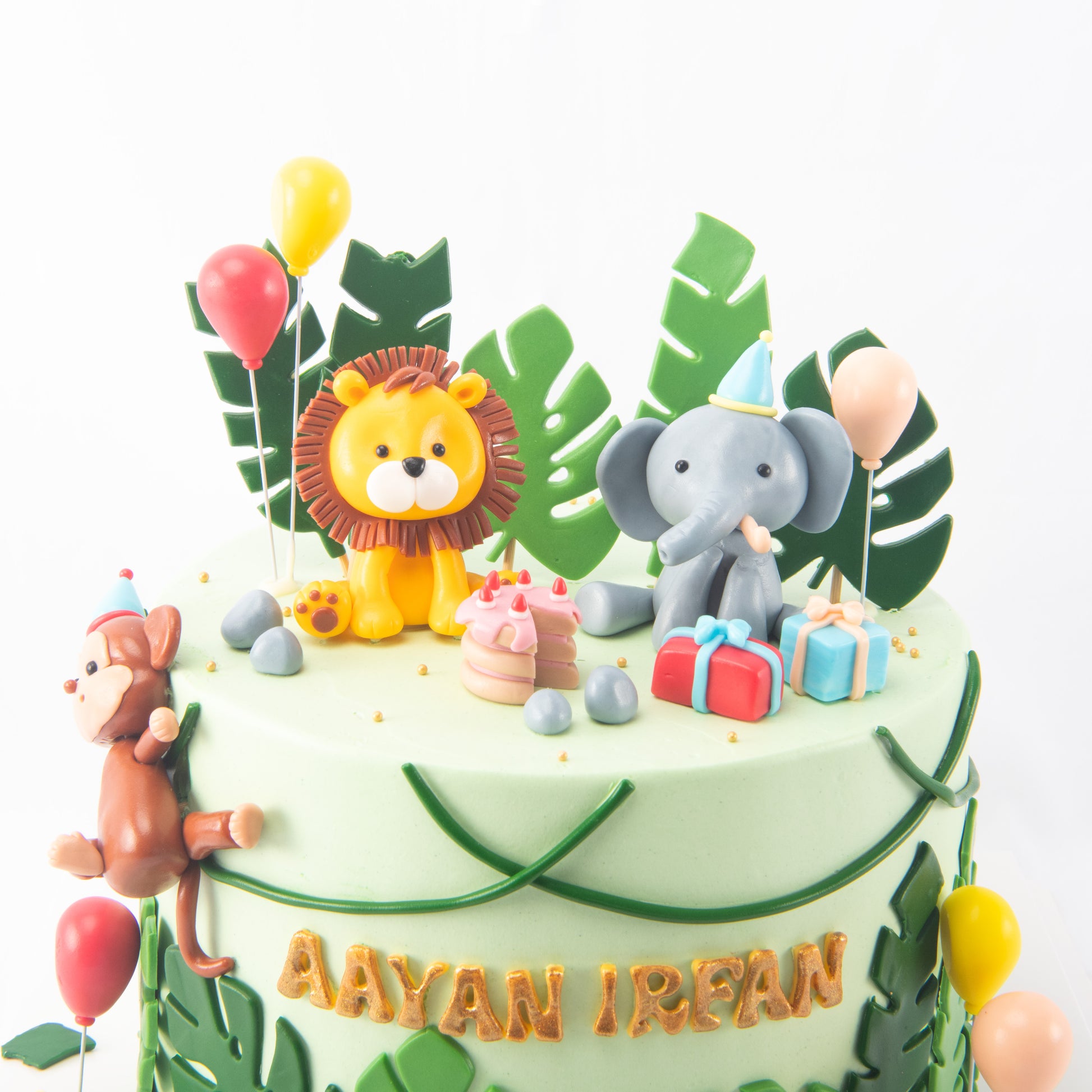 Turn your celebration into a wild adventure with our Jungle Friends Birthday Cake! This vibrant green buttercream cake is decorated with lush jungle leaves, colourful balloons, and adorable animal toppers — a cheerful lion, a playful elephant with gifts, and a mischievous monkey climbing the side. Perfect for animal-loving kids, this cake is full of fun, colour, and charm.