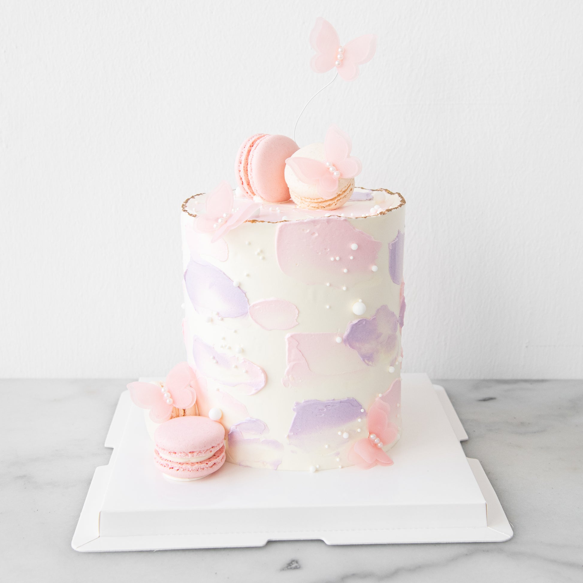 Delicate and dreamy, our Butterfly & Macaron Bliss Cake is the perfect blend of elegance and sweetness. Featuring a soft white buttercream base with hand-painted pastel pink and lavender brush strokes, it’s adorned with edible pearls, airy pink butterflies, and dainty macarons. A touch of gold along the rim adds a hint of luxury, making it ideal for sophisticated celebrations.
