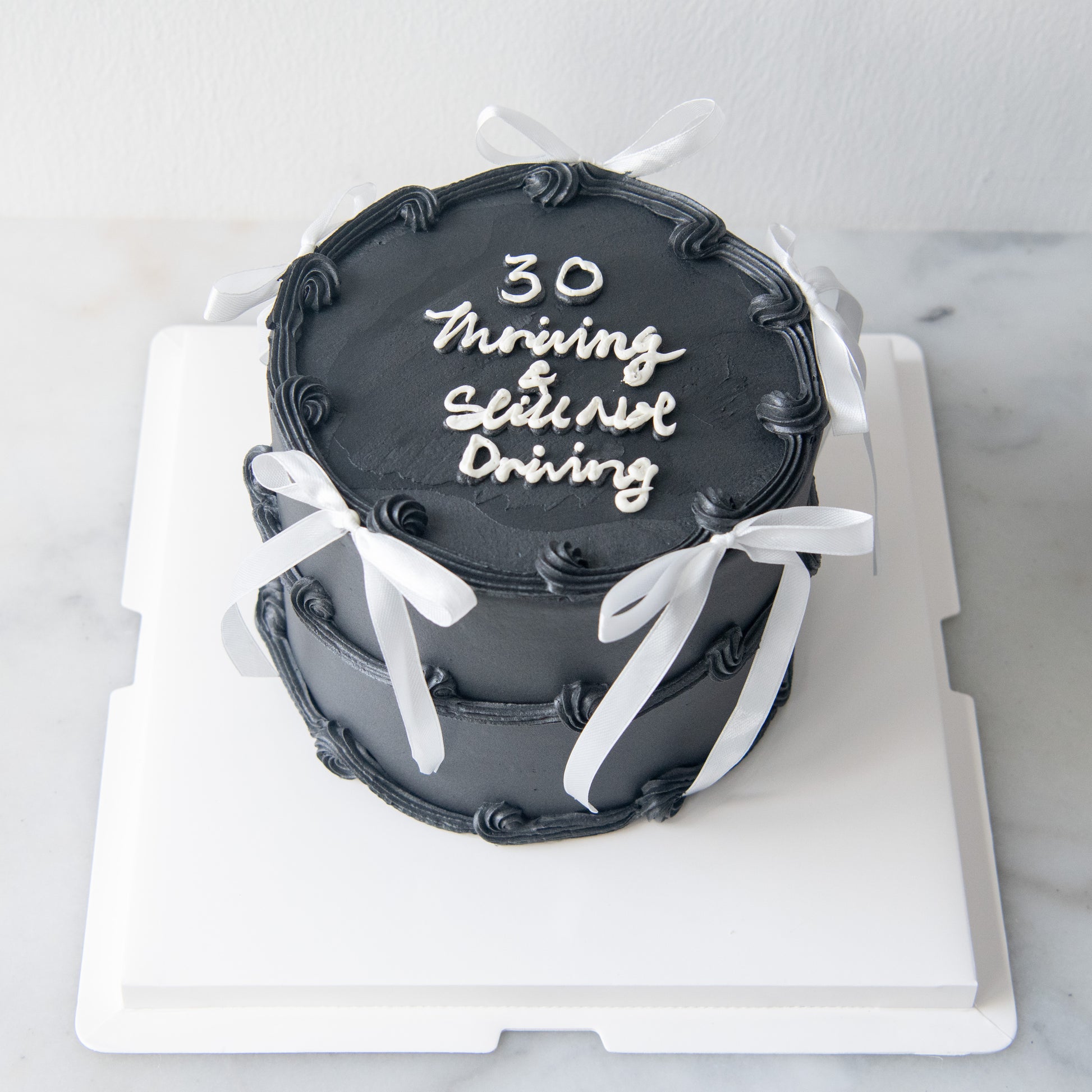 Make a bold statement with our Midnight Ribbon Cake! This striking design features smooth black buttercream, classic vintage-style piping, and crisp white satin bows for a dramatic yet elegant contrast. Perfect for milestone birthdays, themed parties, or anyone who loves a modern, edgy twist on a classic cake design. Personalise it with your own message to make it uniquely yours.