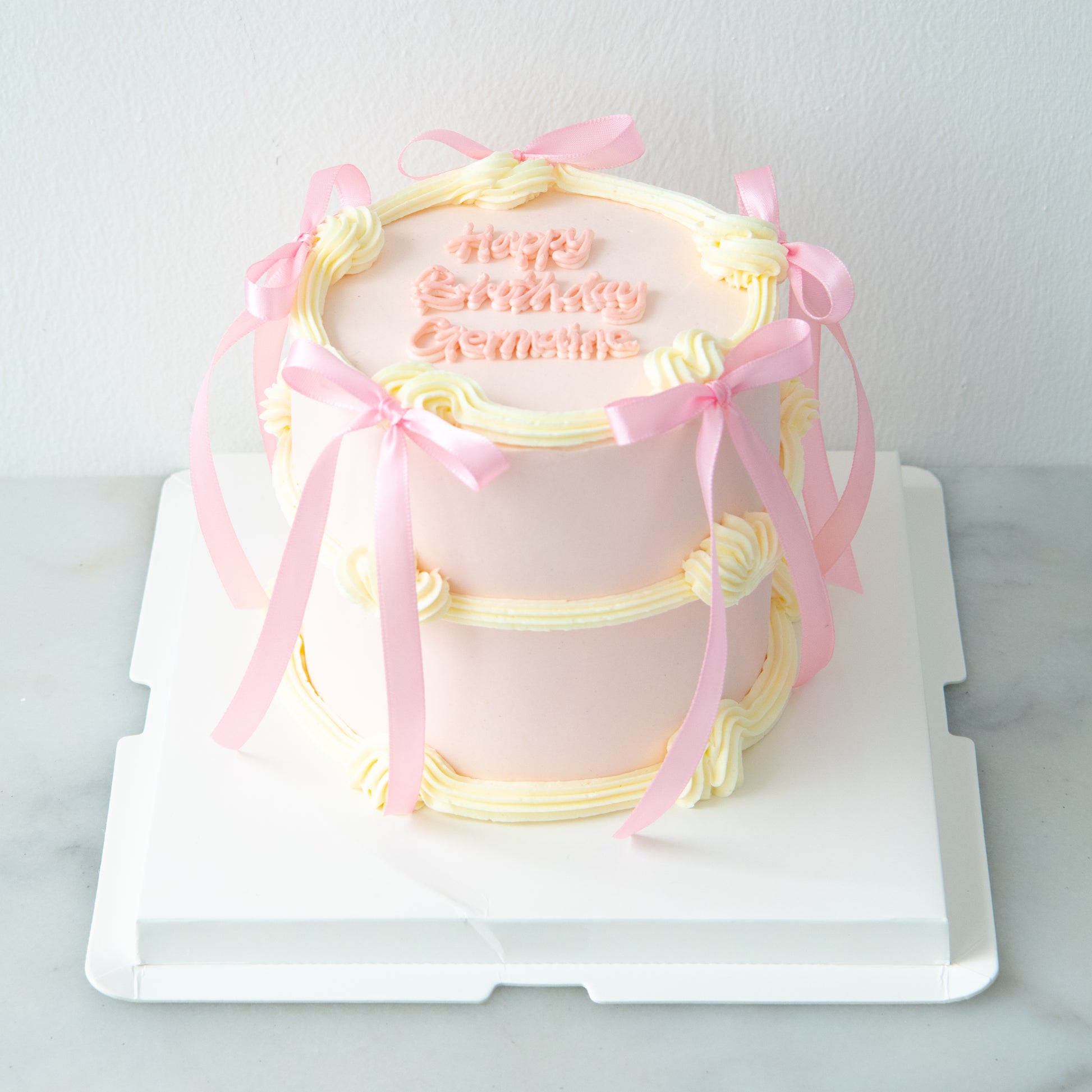 Customized Cake - Pastel Pink Vintage Ribbon Cake – Soft Yellow Piping & Satin Bow Accents