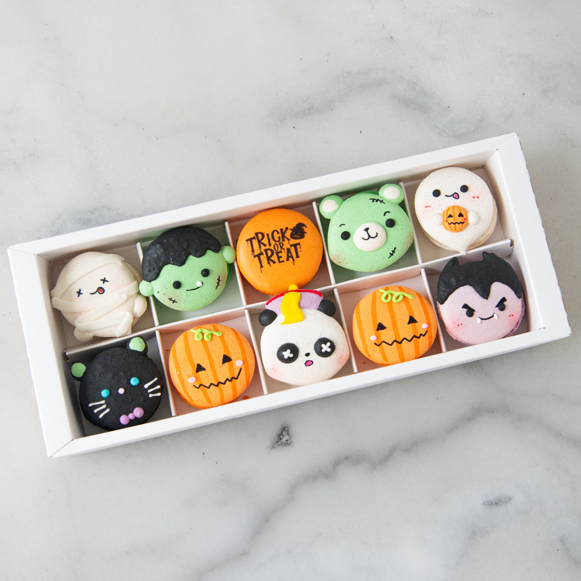 Get ready to treat yourself with our 10in1 Wicked Monster Bites Macaron set—10 delightfully spooky and adorable Halloween-themed macarons! Featuring an undead cute panda, pumpkin heads, vampire, black cat, zombie bear, zombie, and ghosts, each bite-sized macaron is crafted to both charm and satisfy your sweet tooth.
