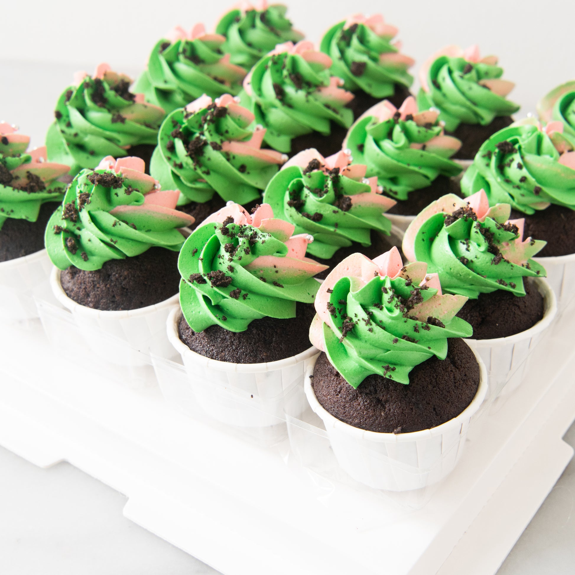 Each chocolate cupcake is crowned with a luscious swirl of vanilla buttercream — green topped with Oreo crumble for a touch of crunch, and pink adorned with delicate sugar pearls for a hint of sparkle.
