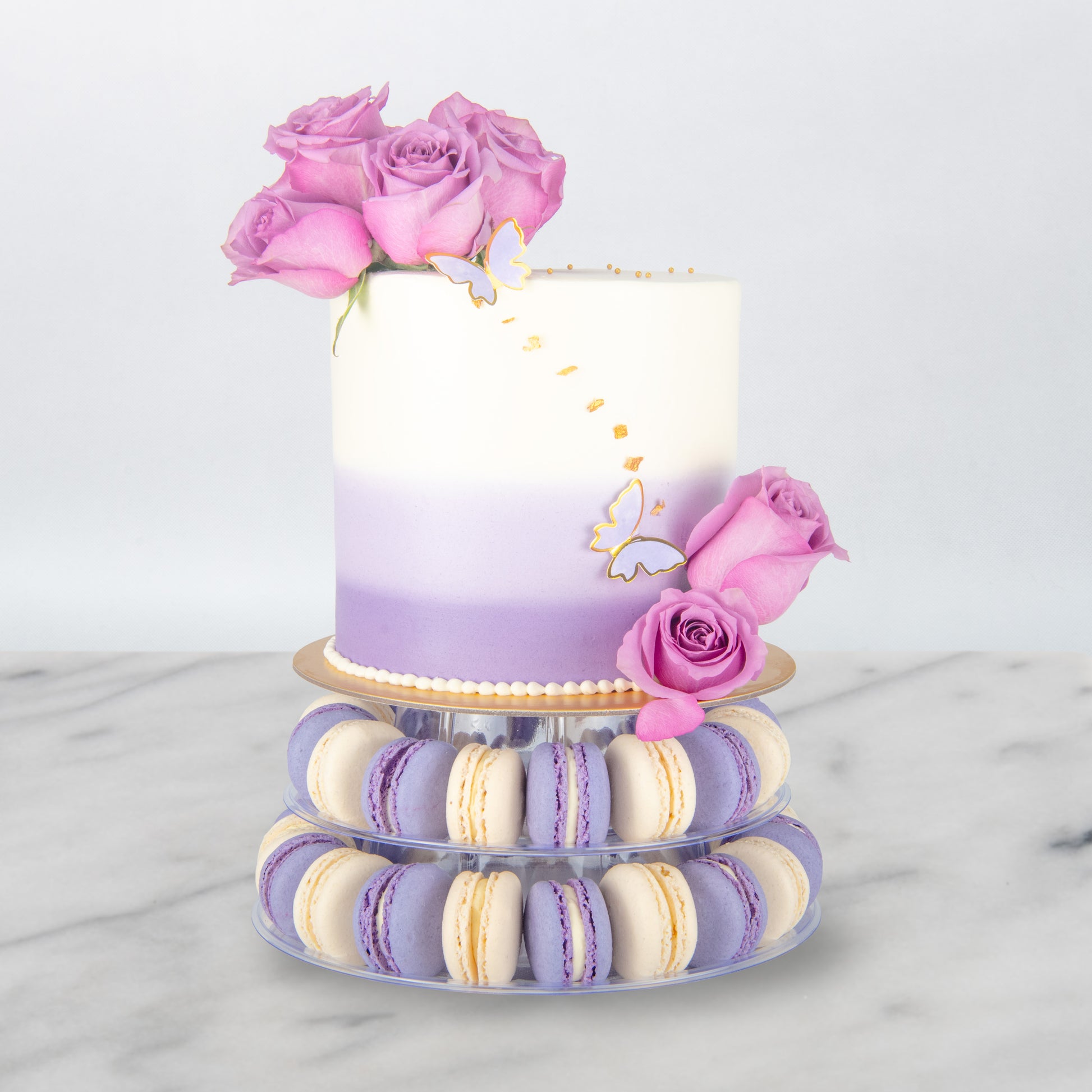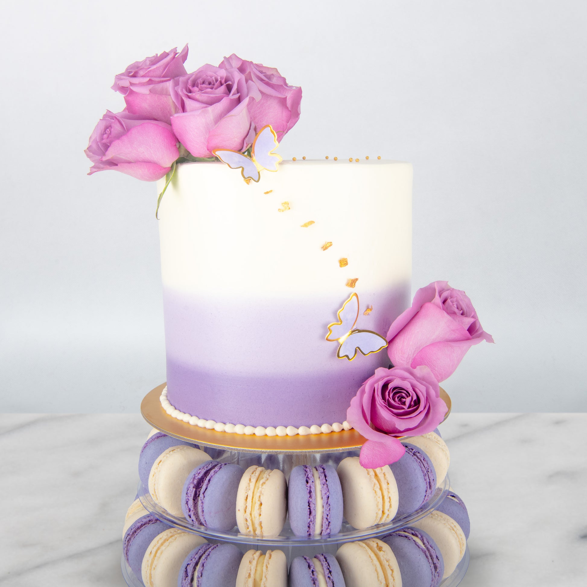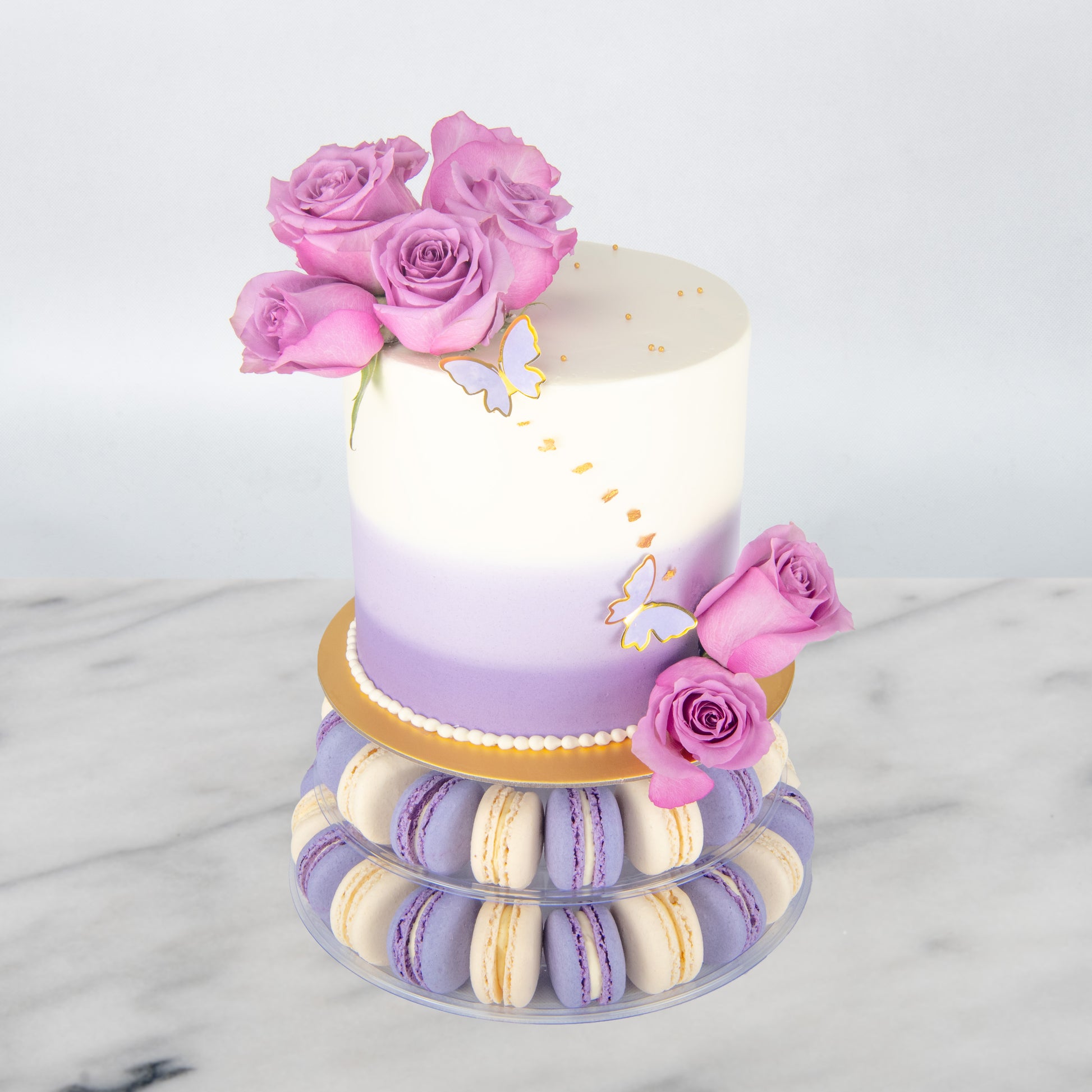 Make your celebration unforgettable with our Lavender Elegance Macaron Tower Cake! This stunning creation features a smooth white-to-lavender ombré buttercream cake adorned with delicate gold-edged butterflies, edible pearls, and fresh purple roses. The cake sits atop a two-tier display of 40 luscious macarons in matching lavender and cream shades, creating a show-stopping centrepiece for weddings, birthdays, and special occasions.