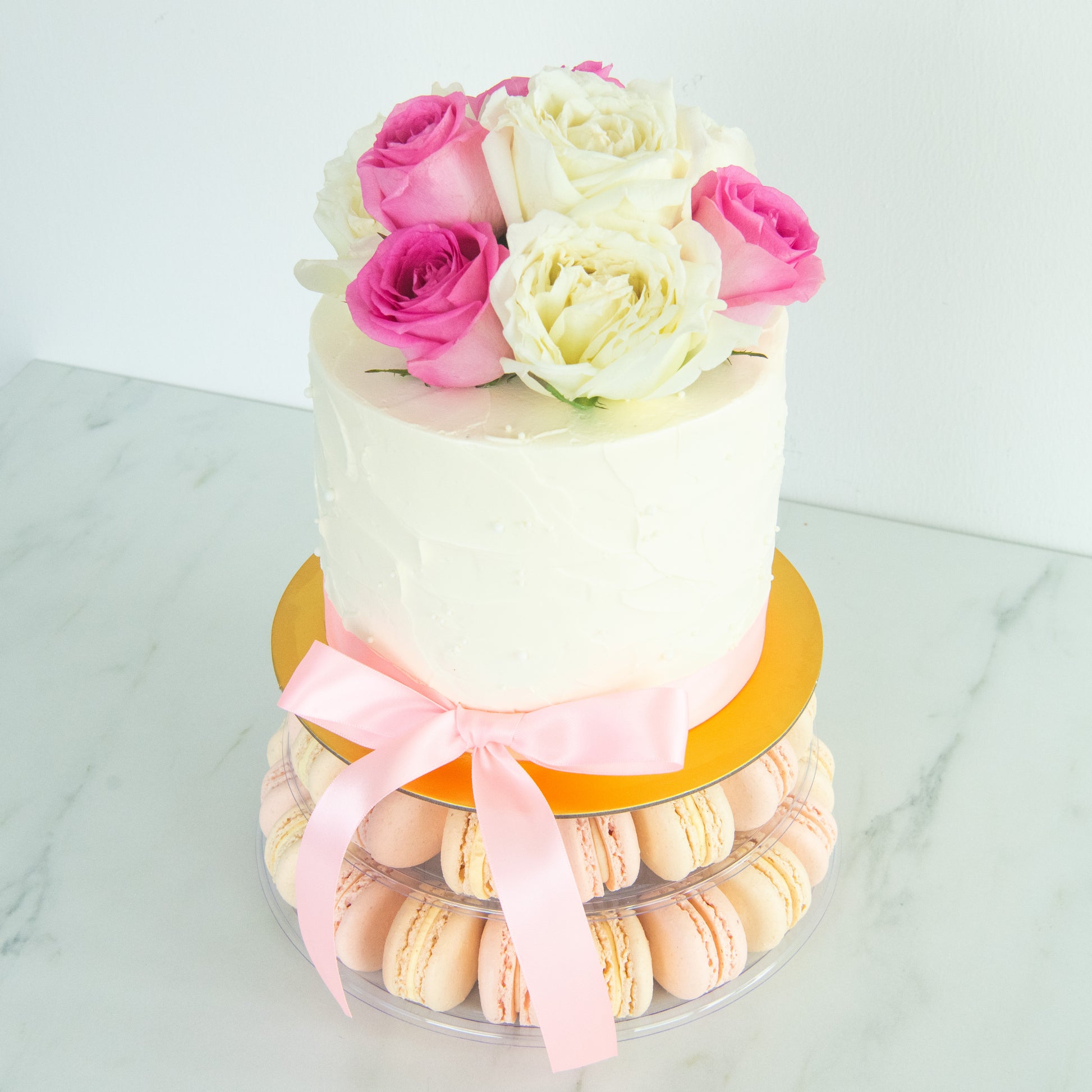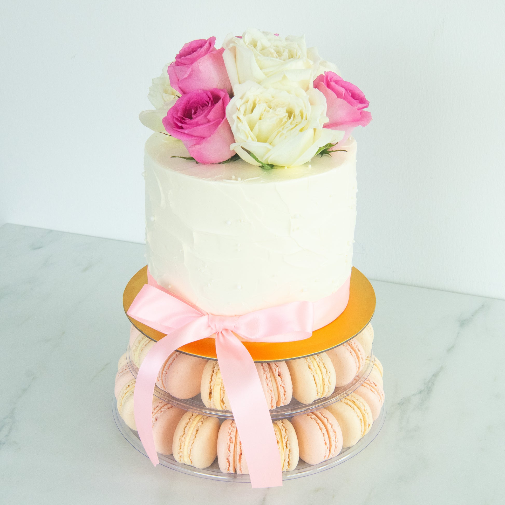 Wedding Cake- Pink & White Bloom Macaron Tower Cake – 40 Macarons & Fresh Roses