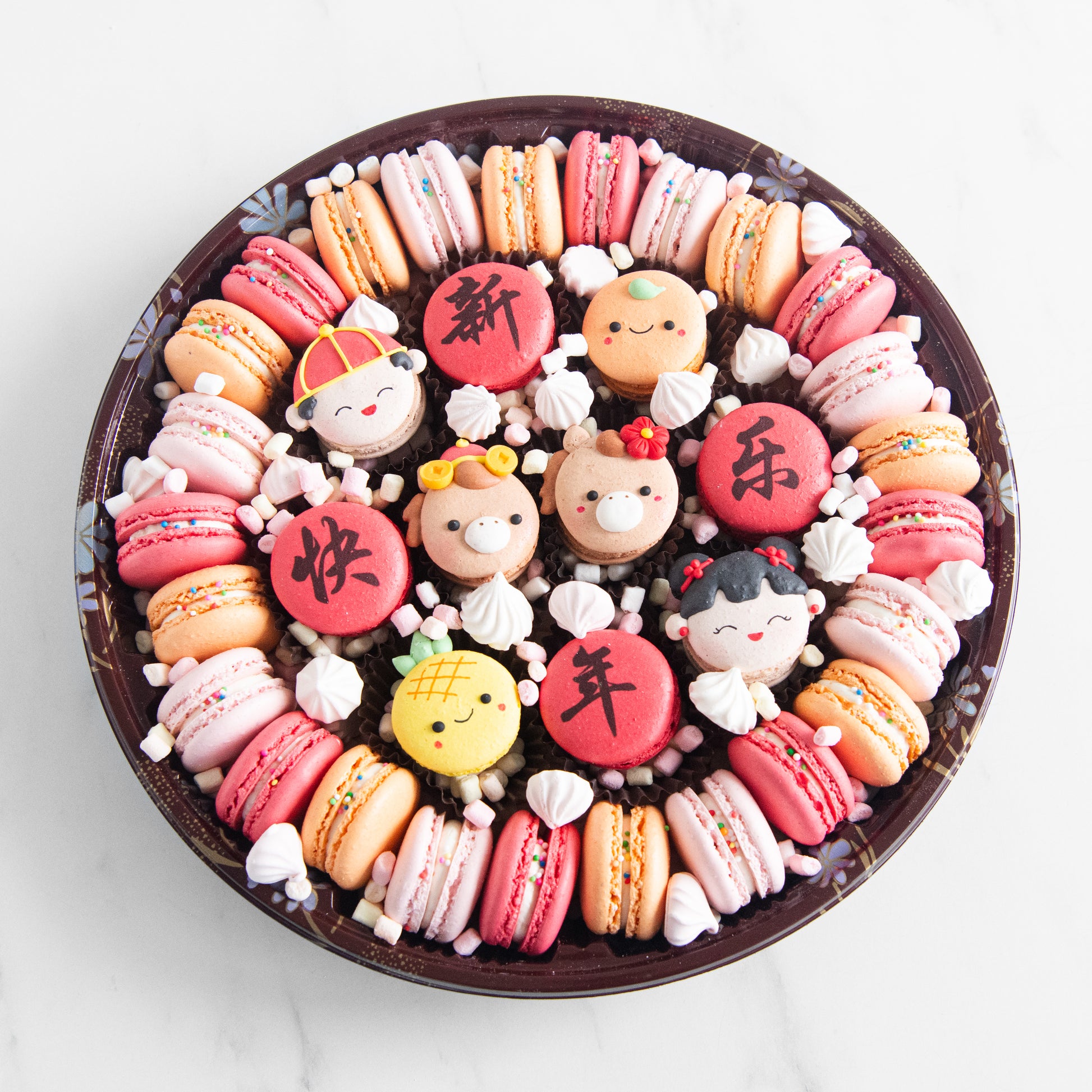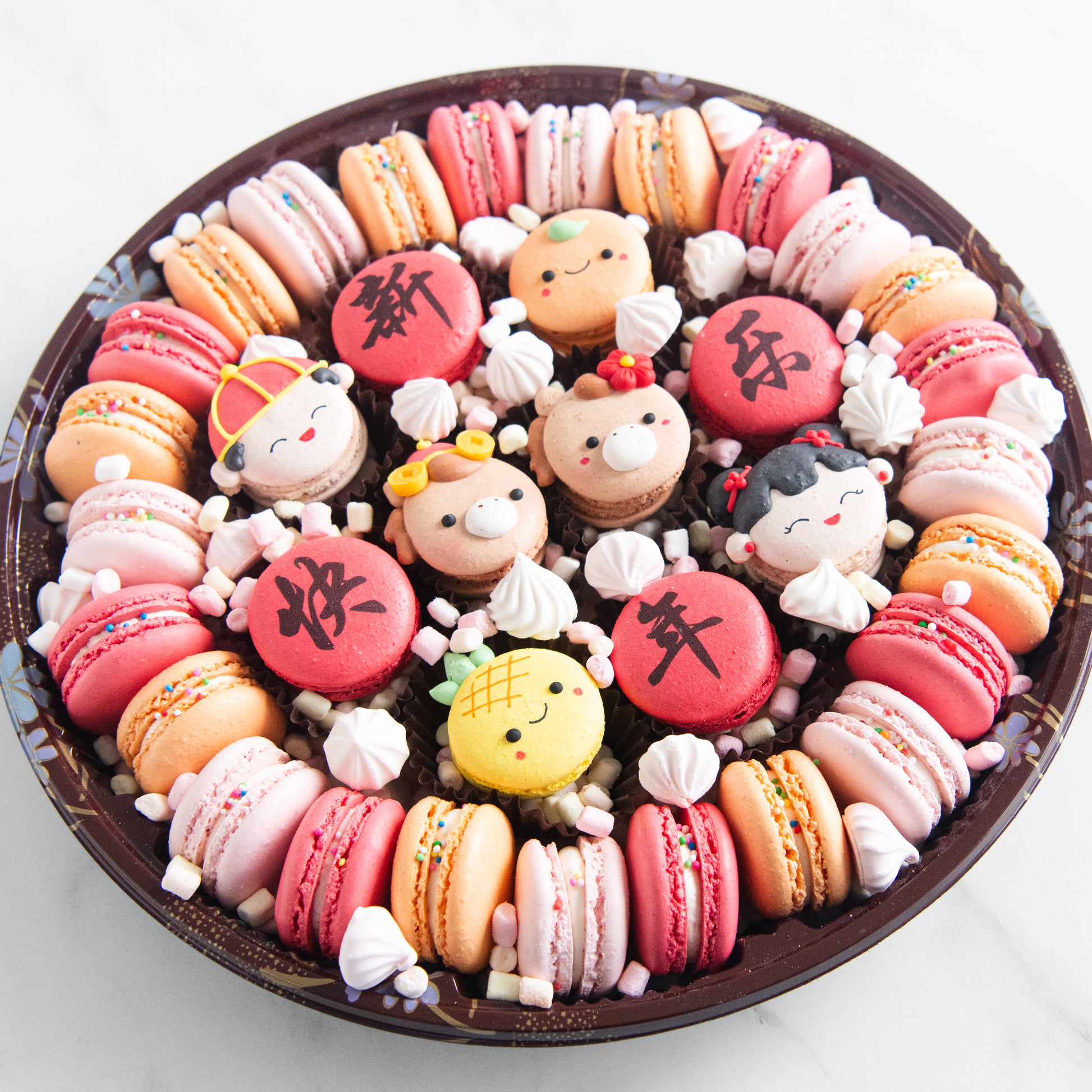 Indulge in the exquisite charm of the Lucky New Year Jumbo Treasure Macaron Set — a lavish collection of 35 meticulously crafted macarons created to celebrate the Chinese New Year and honor the Year of the Horse. Each macaron is beautifully adorned with whimsical designs featuring playful children and adorable horses, symbolizing joy, prosperity, and good fortune.